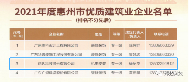 近日,惠州市建筑业协会公布了2021年度惠州市优质建筑业企业、优质工程监理企业名单。按照住建局指导的遴选办法要求,经第三方机构评定、征求相关部门意见和综合评审,评出市优质建筑业企业,其中专一级企业4家,炜达科技股份有限公司荣获2021年度专一级“惠州市优质建筑业企业”称号。